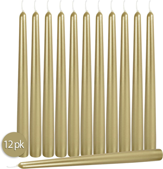 Elegant 10-Inch Cream Gold Taper Candles - Dripless & Unscented - 12 Pack with 8-Hour Burn Time