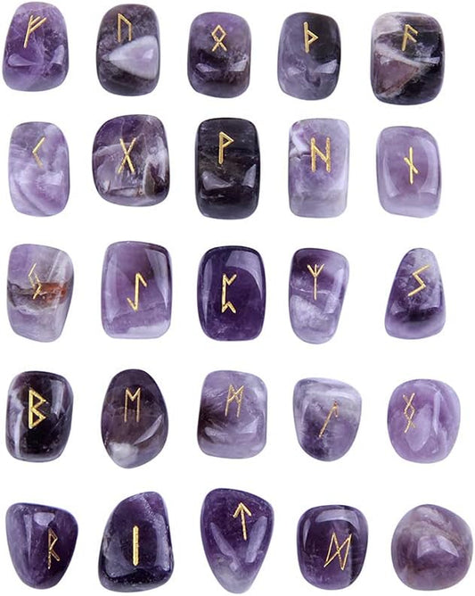 Amethyst Rune Stones Set Engraved Pagan Lettering with Instruction Booklet and Velvet Pouch
